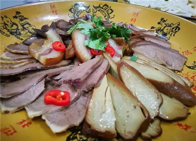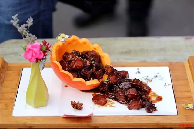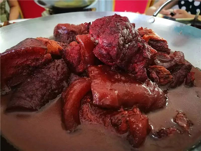 这道菜品选用金寨黑毛土猪肉、百年秘制老卤加以农家传统手法烹制。古碑红烧肉汁鲜美,色泽红润,已成为金寨红烧肉的招牌,而红烧肉成为外地游客到金寨必吃的美食。