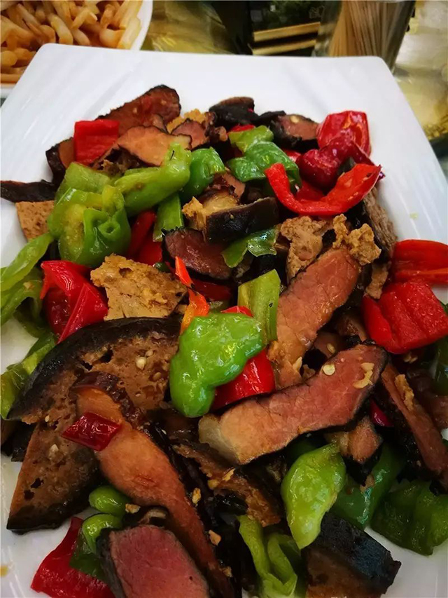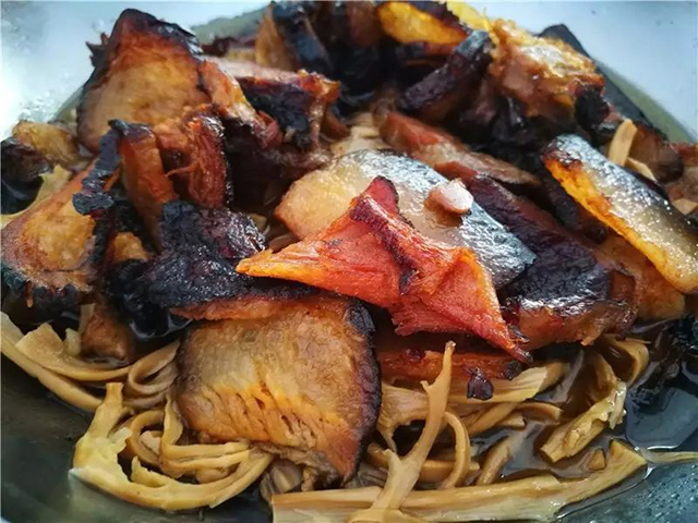 脆嫩的春笋,油腻喷香的腊肉配上红椒青蒜,色香味俱全。冬笋炒腊肉,这道菜应该算得上是金寨春天菜中的经典了。每到笋子上市的季节,鲜嫩的冬笋再配上腊香味十足的腊肉,那种滋味,吃过的朋友们一定会迷恋上它滴!因为笋子不宜过密,主人适当间伐更有利于竹子生长,实际上是生态菜品。
