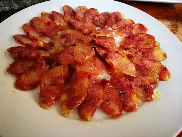 腊肠不加淀粉,可贮存很久,熟制后食用,风味鲜美,醇厚浓郁,回味绵长,越嚼越香。可开胃助食,增进食欲。特别是春荒三月,喷香的腊香肠一口,嘴角流油,顿时有了食欲,不管减不减肥,干了三大碗再说。