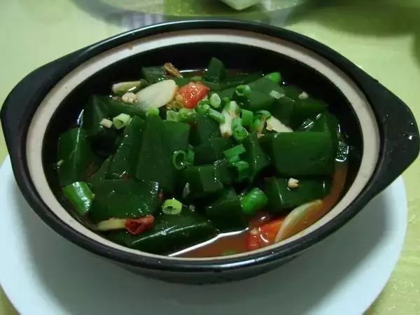 说是豆腐,其实并非用豆子做成,它的原料是山上常见的一种民间叫“观音树”的灌木的叶子。摘得一些叶子,拿回家中洗净,用开水浸泡片刻,然后用手反复搓揉、挤压,直到将叶汁挤尽。盆中的清水就变成了一种浓稠的液体混合物。而后用一块纱布或白布,将绿汁儿过滤一番。再抓一把干净的草木灰用少许清水调成灰浆并反复过滤后倒入绿叶汁中拌匀。一会儿,加入草木灰的绿叶汁就凝固成一大块“翡翠”,晶莹剔透,柔软滑腻,富有弹性,有些像今日流行的果冻。这时“观音豆腐”就做成了。据说是灾荒年观音菩萨慈悲之心普救众生送的食物,故名观音豆腐。
